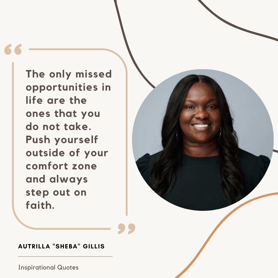 An inspirational quote from an inspiring person! Introducing Autrilla “Sheba” Gillis! “The only missed opportunities in life are the ones that you do not take. Push yourself outside of your comfort zone and always step out on faith.”